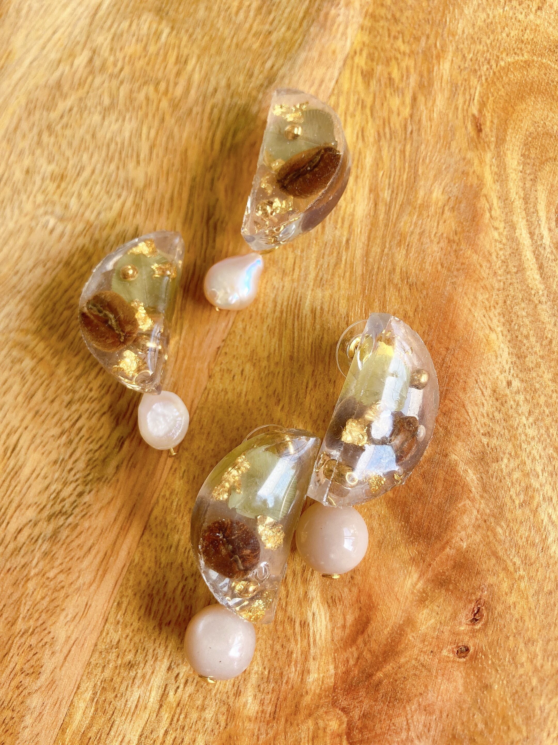 レジンにコーヒー豆と金箔、ドライの植物を封入しました。